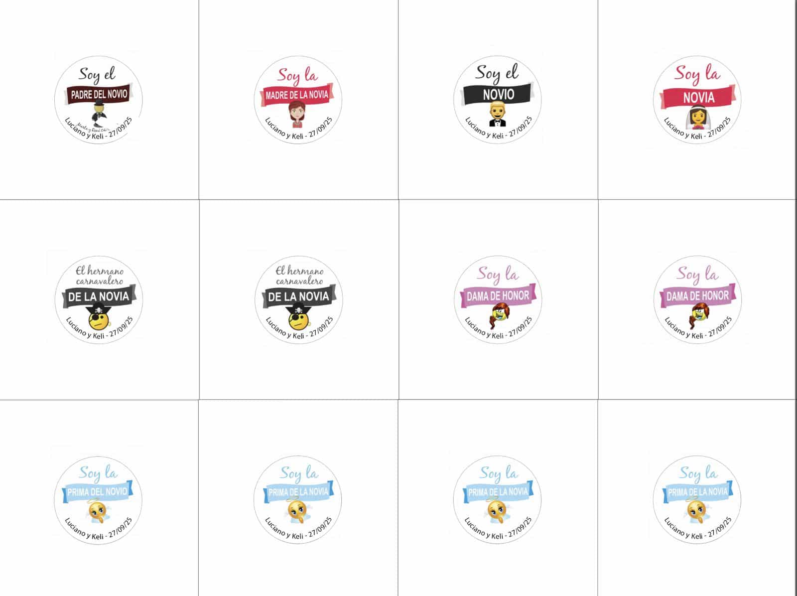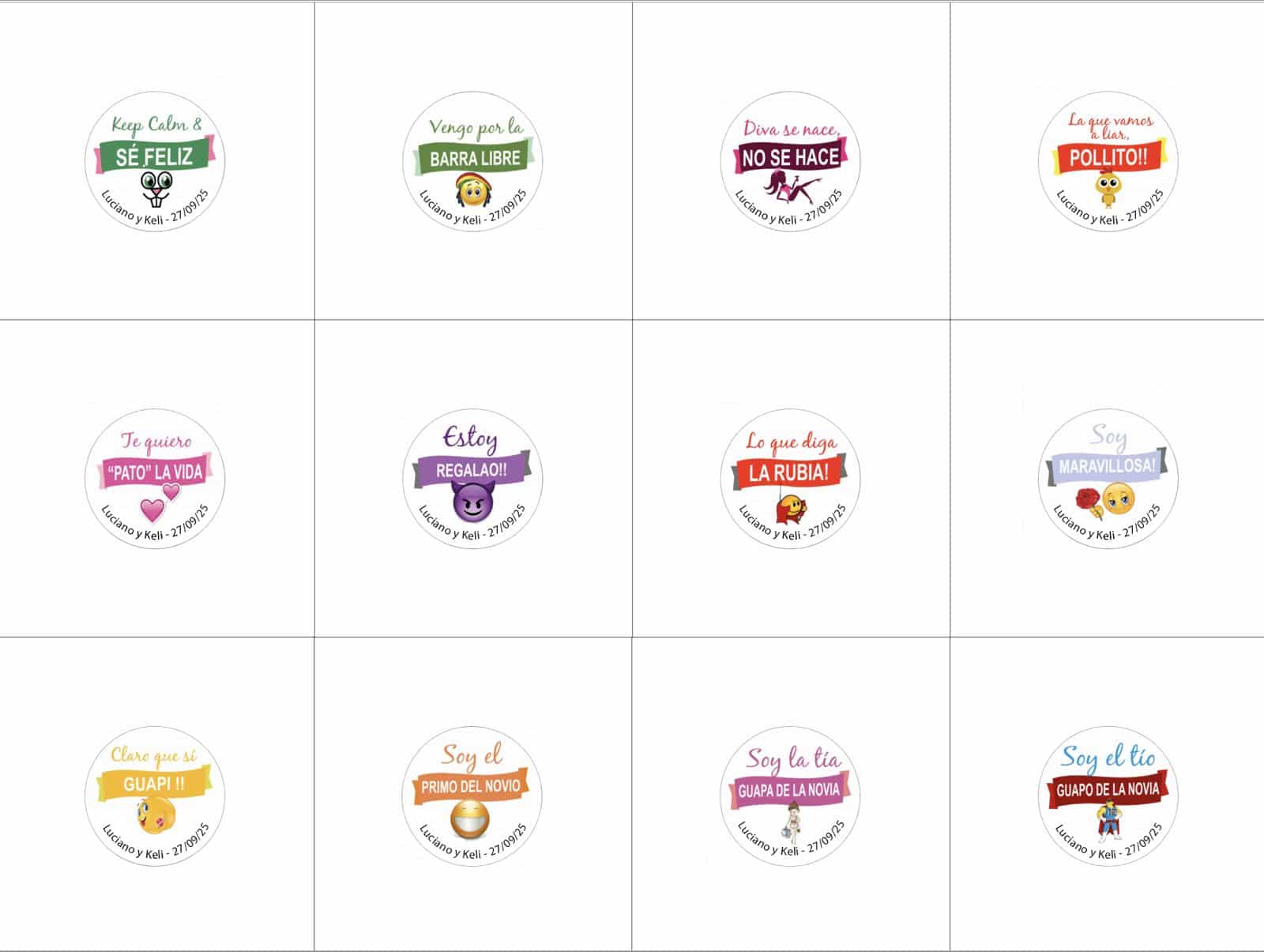Divertidas chapas de alfiler con frases variadas. Cada chapa va personalizada con nombres y fecha. Son ideales para poner en la barra libre.